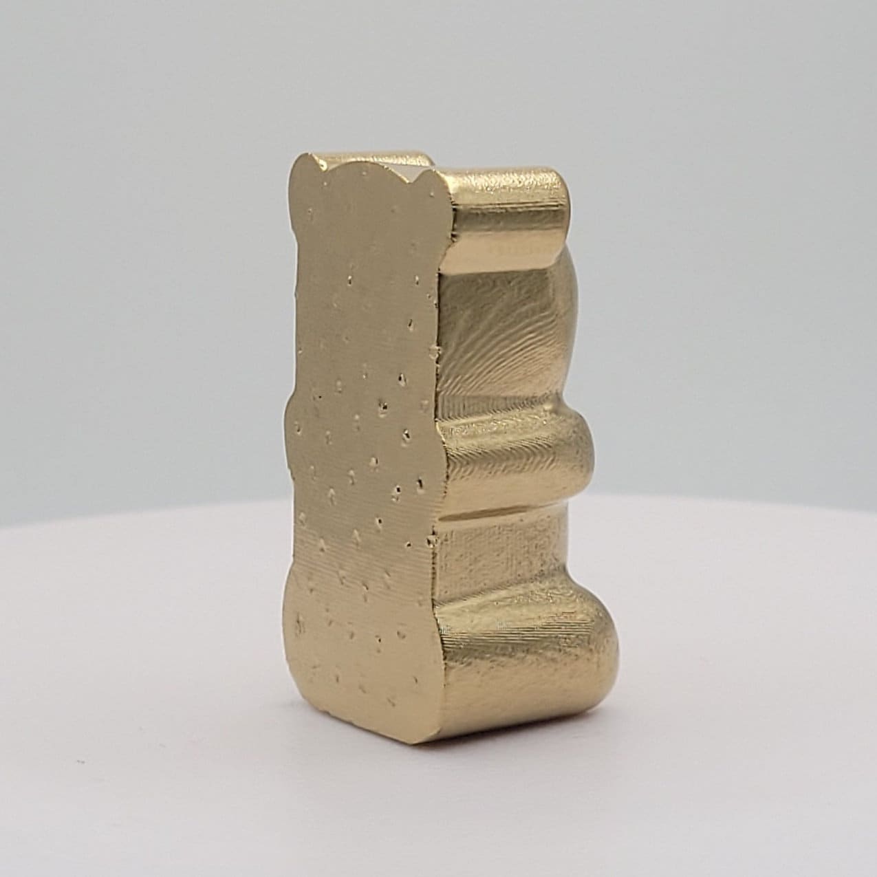 3D Printed Gummy Bear Figurine painted in metallic gold.